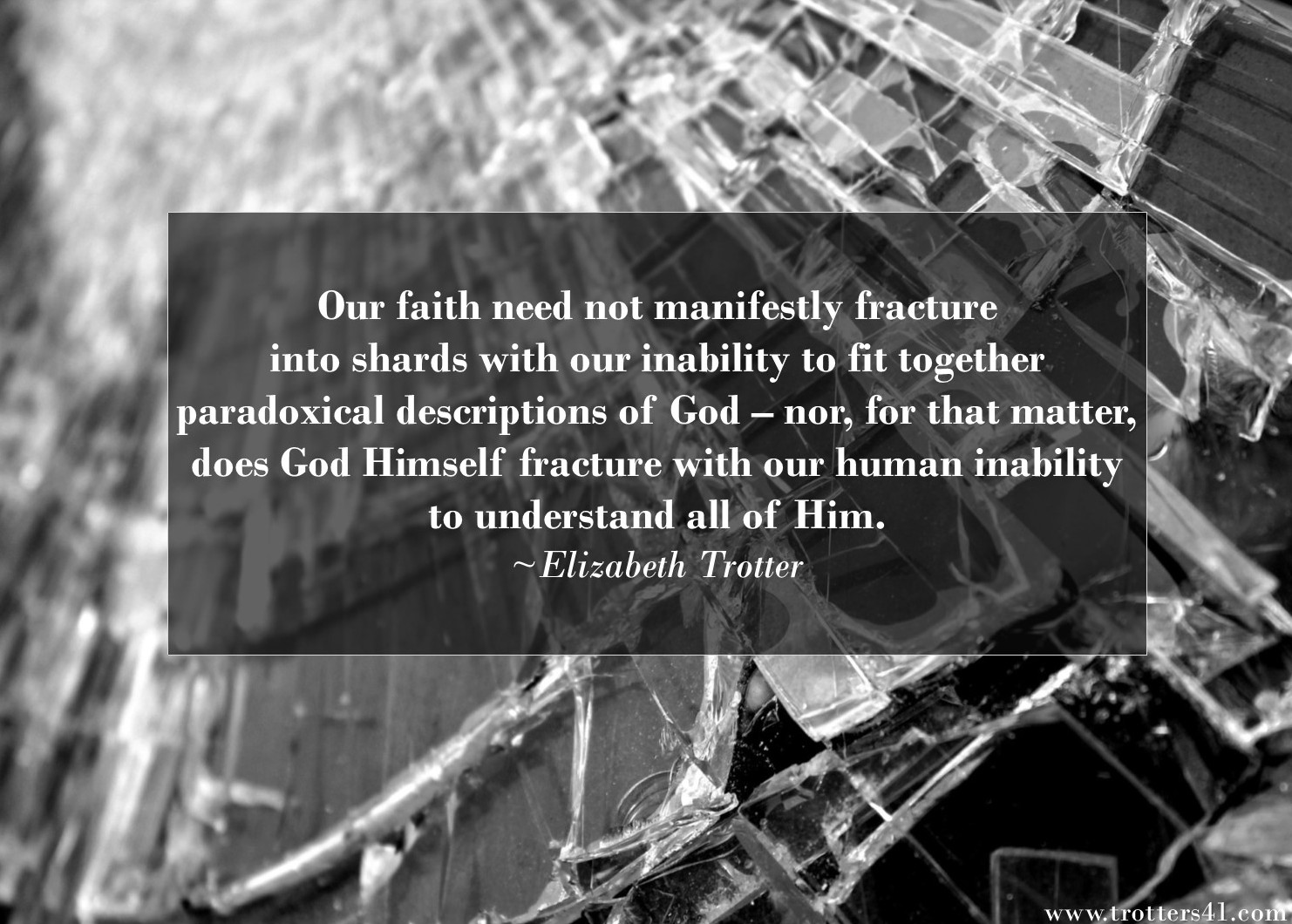 I do not need to fully understand the way the universe works in order to accept that it does work. I do not have to fully understand Jesus’ words in order to accept them as Truth. This is the enigma of loving a limitless God.  This is the mystery of life with Christ, God-made-flesh. This is the joy of a faith that won’t fracture.