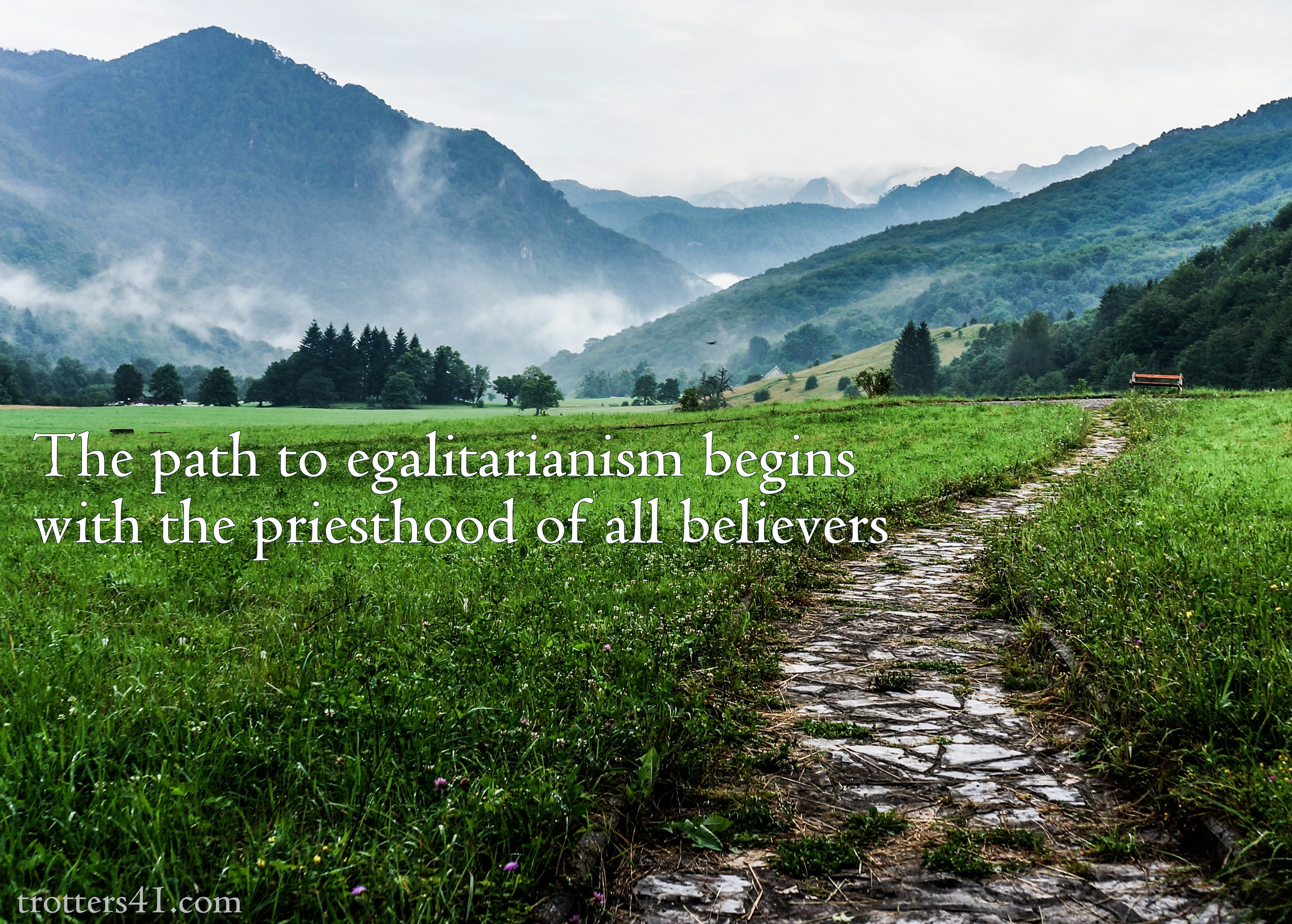 Looking back now, I can see that the path to egalitarianism begins with the priesthood of all believers. We went into marriage saying we believed in male headship, yet in decision-making, we fully expected God to speak to both of us. We believed we could, and would, both hear from God, and that God would say the same thing to both of us. Blame it on the Experiencing God craze of the 1990’s if you want, but this is how we approached God from the very beginning of our marriage.